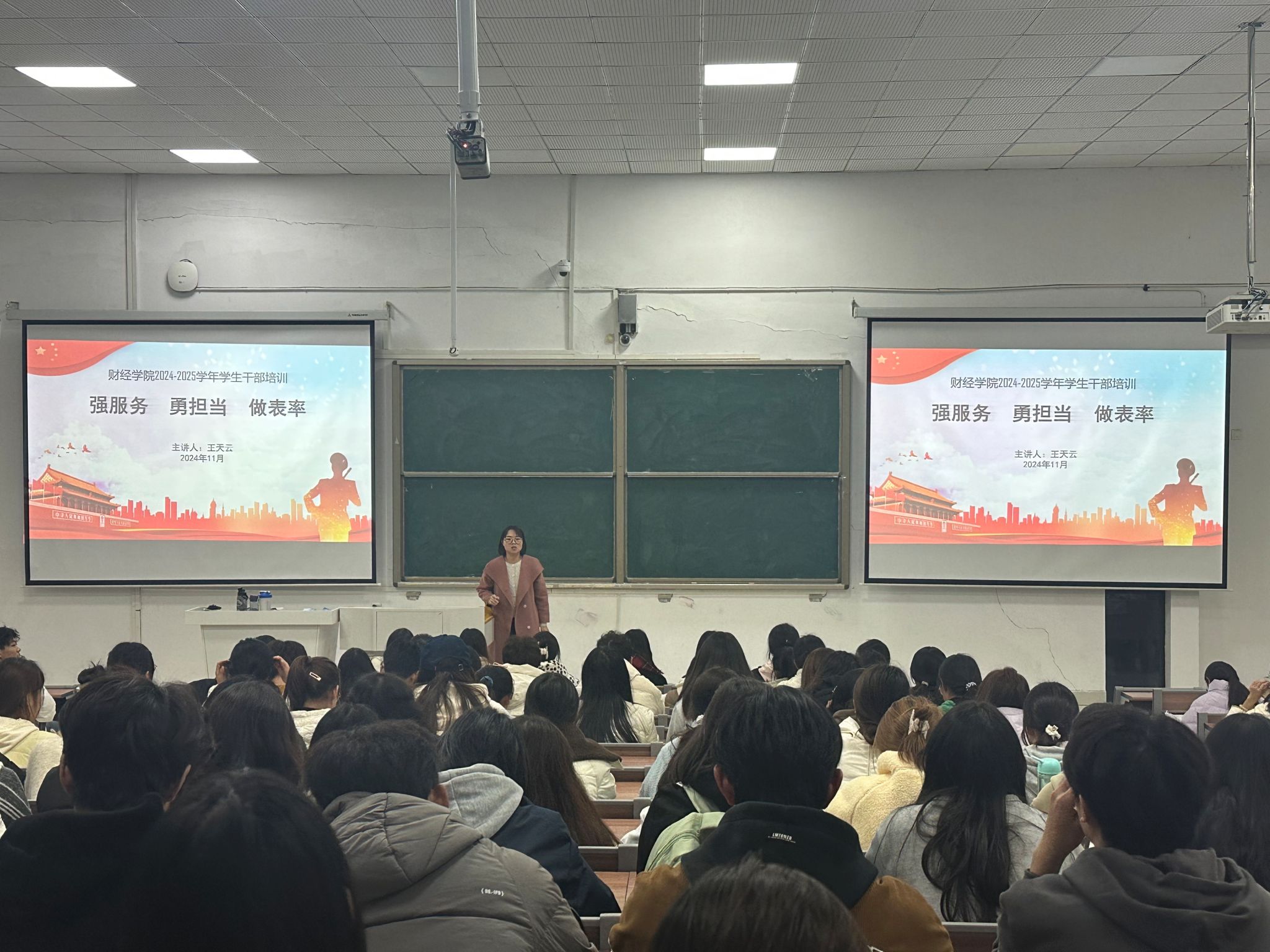 11月25日,财经学院在致知楼A111举办了2024-2025学年学生干部培训班。辅导员王天云以“强服务、勇担当、做表率”为主题作了第一讲。学院2024级全体学生干部参加会议。