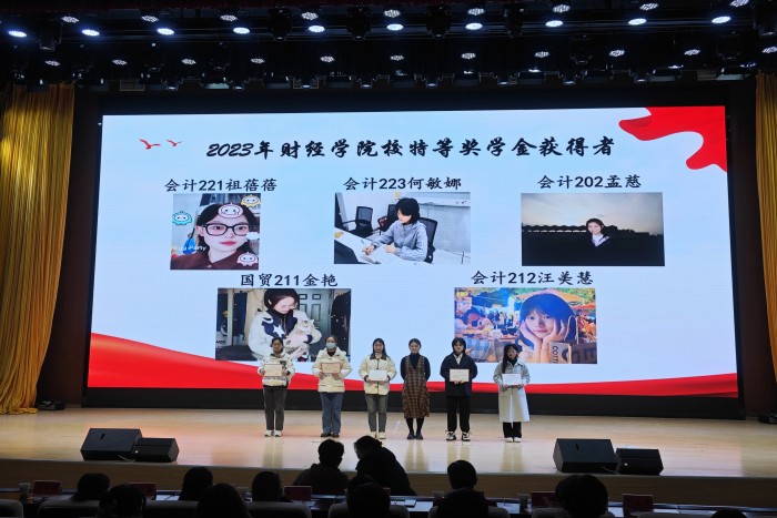 党政办公室主任张俊宣读2023年荣获校级表彰集体、国家励志奖学金、国家奖学金、省级学科竞赛等获奖名单。辅导员尹成超宣读了《中国足彩网公布财经学院第七届“财经文化节”系列活动结果的通知》。学院全体领导老师为获奖集体和同学颁奖。
