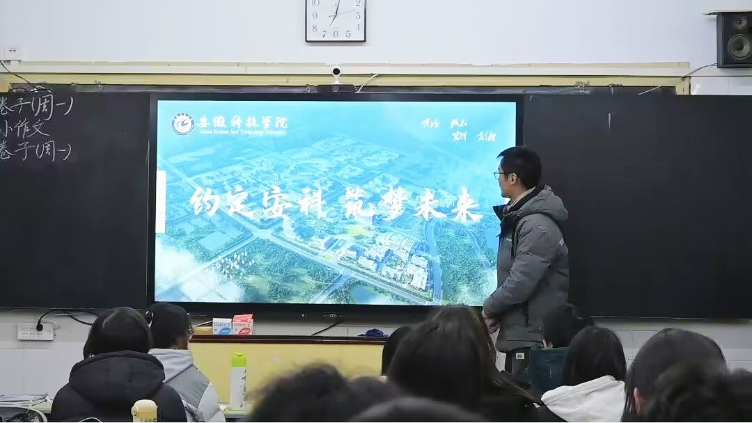 在宣讲活动中,张航团队首先播放了安徽科技学院的宣传片,之后就学校的办学历史、师资力量、学科建设、科研成就以及学校的学风建设与就业情况等内容进行了详细介绍了,让在场的高中生们对安科有了更加直观的认识和了解。最后团队成员介绍了他们在安科的学习生活情况,分享了他们在高中的学习经验和方法并鼓励学弟学妹们努力学习,考上自己心仪的大学,实现人生梦想。