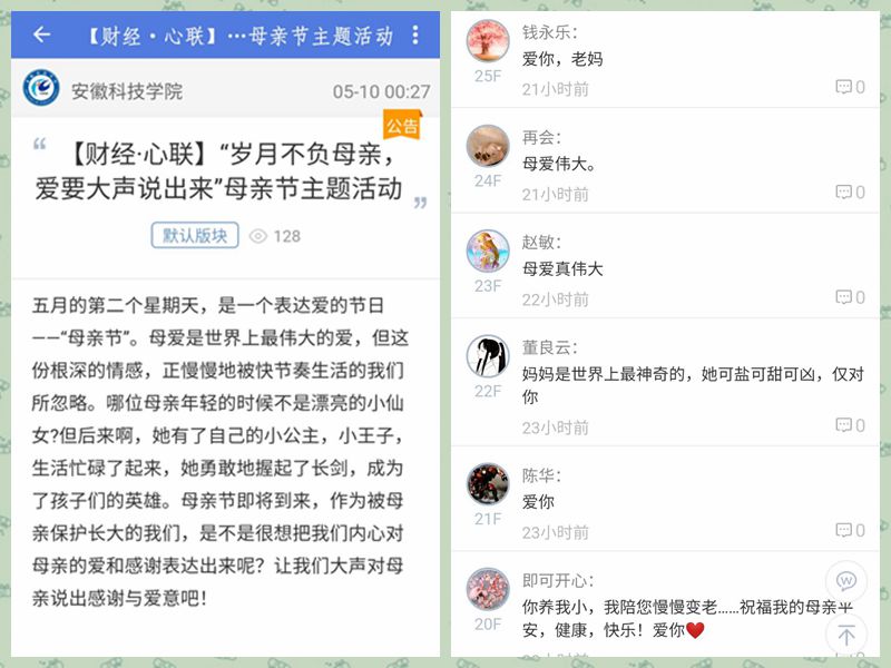 此次活动通过易班线上开展,活动共分为两大板块,第一板块为“妈妈,我想对您说”,同学们通过活动平台用文字表达了自己想对妈妈说的心里话。有的用文字记录伟大而平凡的母爱、有的感谢母亲的养育之恩,表达了自己对母亲的深情祝福。朴素的话语传递着感恩之心和赤子之情,洋溢着温馨的感动;第二板块为“我和我的美丽妈妈”,同学们在平台踊跃分享了母亲节当天与母亲的留影及小时候和母亲合影的珍贵瞬间,大家感受着浓浓的慈母情,在温暖的母爱里尽情地荡漾。