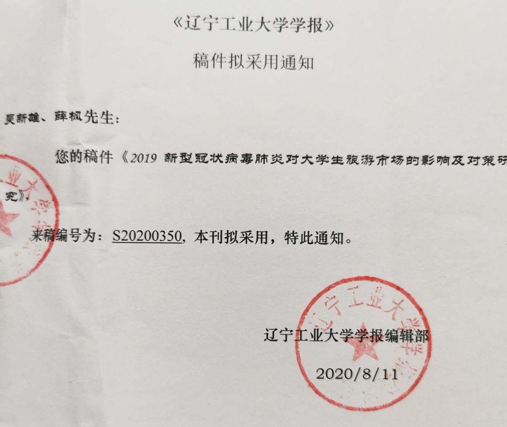 为贯彻落实习近平总书记在统筹推进新冠肺炎疫情防控和经济社会发展工作部署会议上的重要讲话精神,助力“六稳”“六保”,为疫情防控和市场复苏作出贡献,财经学院金融工程175班学生吴新雄开展疫情对旅游市场影响的云调研,以第一作者身份撰写的论文《2019新型冠状病毒肺炎疫情对大学生旅游市场的影响及对策研究》,被辽宁工业大学学报拟采用。