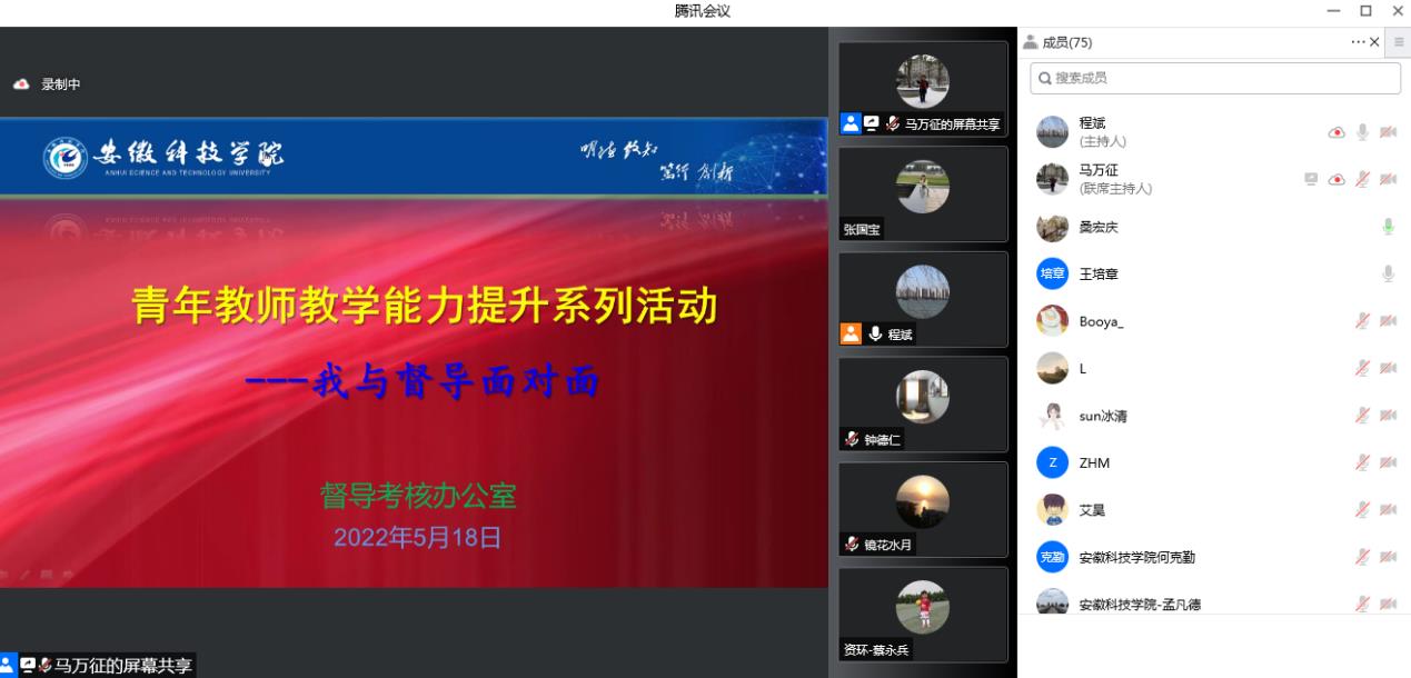 为深入推进“我为师生办实事活动”,进一步帮助青年教师站稳讲台、站好讲台,促进青年教师教学水平提升, 5月18日下午,我校通过线上平台联合举办了“我与督导面对面”——青年教师教学能力提升活动,活动邀请了党员钟德仁、苏兆龙、桑宏庆、黄保宏、庄锁法为青年教师答疑。督导考核办公室、校教学督导员代表、资源与环境学院和管理学院督导组成员以及近五年来新进教师等参加会议,会议由督导考核办公室副主任王培章主持。
