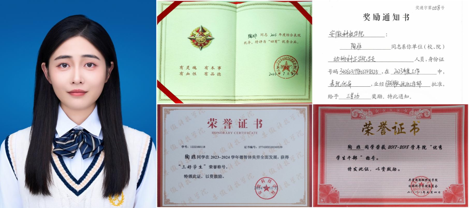 李晴晴,中共党员,2021级动物医学专业本科生,曾担任班级团支书,曾获校优秀学生干部、学业一等奖学金、三好学生、2023年蚌埠市排球联赛女子组团体第三名等荣誉。目前以优异成绩拟录取为中国农业科学院兰州畜牧与兽药研究所基础兽医学专业研究生。