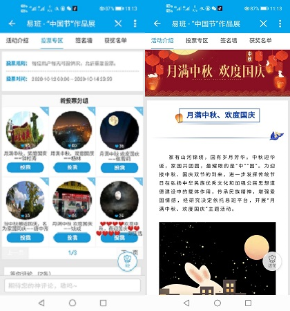 本次活动通过向广大学生征集中秋团聚、中秋赏月、祝福祖国华诞等主题的优秀图片、视频和文字作品上传至易班轻应用展开。活动期间,同学们在学院易班微社区晒出自己对伟大祖国的美好祝愿以及自己的小长假安排。最终经易班网络投票评出一等奖二名,二等奖三名,三等奖五名。