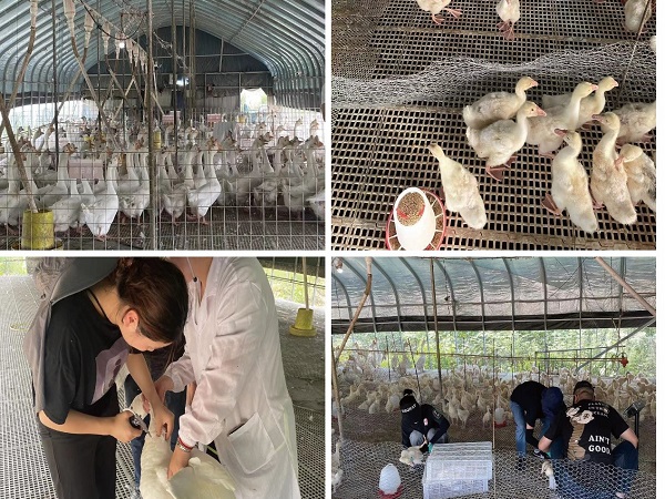 7月13日,团队在基地厂长王本川的带领下,参观了皖西白鹅养殖基地,详细介绍了养殖规模、饲养情况及防疫情况,紧接着团队成员在老师指导下对500只休产期种鹅及300只雏鹅进行了鹅瘟弱毒疫苗及禽流感疫苗接种。