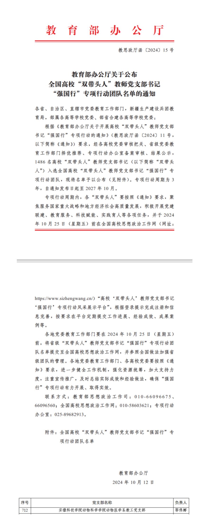 ?我校动物医学教工党支部入选全国高校“双带头人”教师党支部书记“强国行”专项行动团队