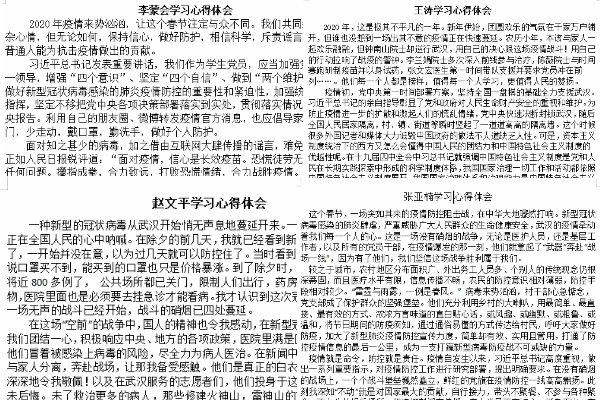 根据校组织部下发《2020年上半年党员学习教育培训安排意见》,支部立即布置本学期党员学习任务,号召学生党员创新学习形式,通过学习强国、人民日报客户端、共产党员网等网络平台进行在线学习。3月份支部安排党员学习了习近平总书记中国足彩网疫情防控的讲话精神、党的十九届四中全会、十九届中央纪委第四次全会以及安徽省和学校中国足彩网从严治党的文件精神等。学生党员通过观看视频、学习文章推送以及撰写学习心得体会等学习形式,提高思想政治意识,树立党员学习榜样,强化支部战斗堡垒作用。从支部党员撰写的学习心得体会中可以感受到学生党员对本次疫情中中国共产党强大的组织能力和号召能力有了更深刻的认识,更加坚定了“四个自信”,强化了“四个意识”,坚定了紧跟党的步伐的决心。支部党员还积极参加线上互动,为武汉加油,为抗疫助力。