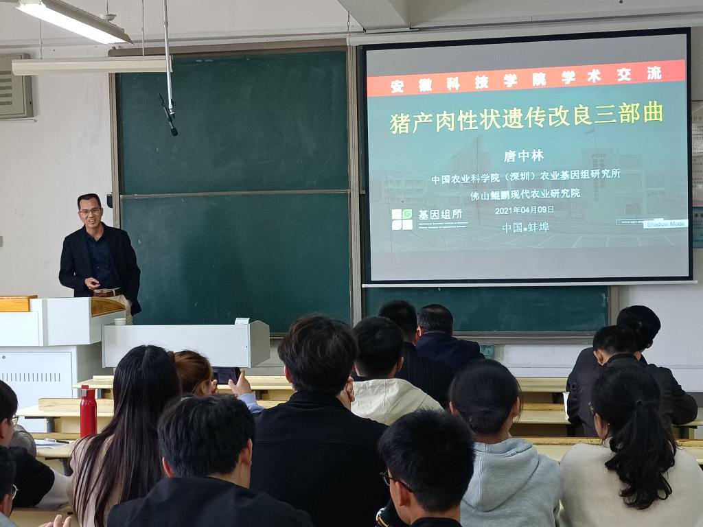 4月9日下午,《安徽科技学院学报》期刊发展研讨会系列学术报告在凤阳校区新知楼A403举行。中国农业科学院“猪基因组设计育种创新团队”首席科学家、中国农业科学院(深圳)农业基因组研究所动物基因组研究中心主任、博士生导师唐中林应邀来校作学术报告。报告由动物科学学院副院长华金玲主持,学院部分教师、养殖领域硕士研究生及动物科学、动植物检验检疫等专业本科生聆听报告。