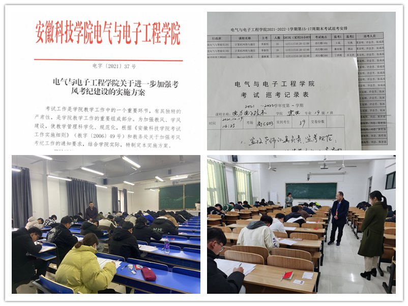 制定工作方案,加强考场巡查巡视。考试工作是学院日常工作中的重要环节,根据学校要求,结合学院实际,学院出台了《电气与电子工程学院中国足彩网进一步加强考风考纪建设的实施方案》,成立以学院党政领导为组长的考风考纪建设领导组,开展考试相关工作。 学院及时做好监考教师培训管理工作,落实责任制,强化监考老师责任意识,维护考试的公平公正。考试期间,学院党政领导、教学督导员、辅导员巡视值班,深入考场一线,及时了解考场情况。