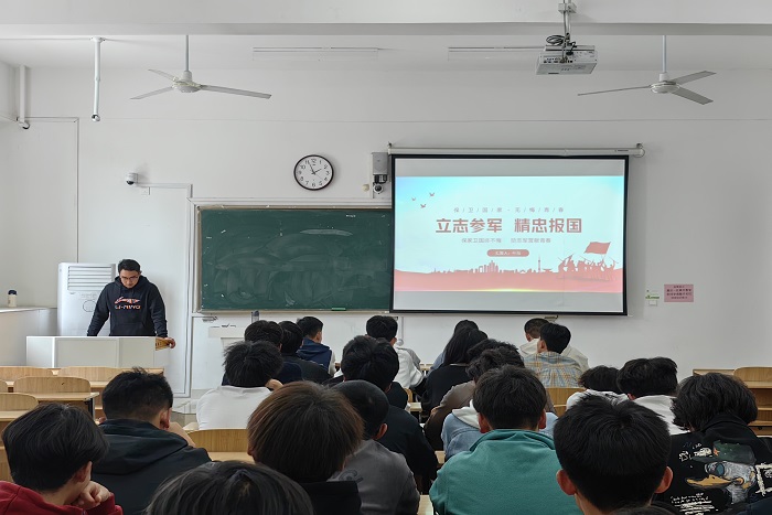 叶旭从大学生参军的意义、参军的要求、应征入伍的流程、优惠政策等内容进行了详细的阐述。随后,他与同学们分享了自己军旅生涯中的成长与收获、感受与体会。他表示,大学生应征入伍既能强健体魄、磨练意志,也能履行国家强军兴军的使命担当。大学生作为祖国未来的栋梁,具备较高的文化素养和专业技能,更应承担起新时代青年的责任和义务,积极投身军营,为国防和军队现代化建设贡献力量。