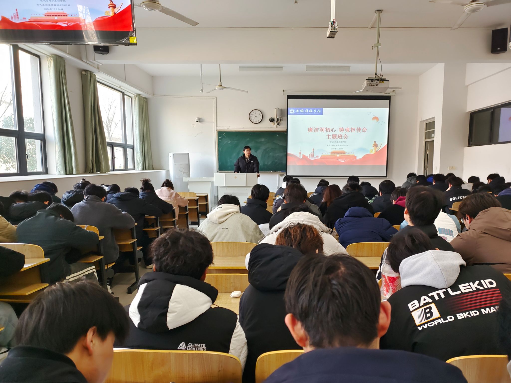 在全面从严治党的背景下,加强大学生廉洁教育,培养新时代青年的廉洁自律意识显得尤为重要。12月24日下午电气与电子工程学院专职辅导员洪乃羽在电气工程及其自动化2022级四个班级中组织开展以“廉洁润初心,铸魂担使命”为主题的特色班会,旨在通过生动鲜活的教育形式,将廉洁文化深植学生心中,营造风清气正的校园环境。
