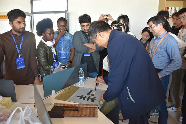 在经过上午“两馆、一校”的参观活动后,参与“大篷车”活动全体人员围坐在由安徽科技学院与南京农业大学和小岗村党委共建的“耕读书屋”中,开展座谈交流。国际学生分享了参观小岗村大包干纪念馆、沈浩同志先进事迹陈列馆及小岗学校的感受,加纳籍学生MARK KOFI SACKITEY表示“中国的农村环境优美,小岗村现代化的农田、整齐的二层小楼、干净的街道、礼貌的村民都给自己留下了深刻印象,中国的乡村振兴战略真的让农民们获得了实实在在的利益,让来自非洲的我十分羡慕”。巴基斯坦籍国际学生ZAIN ABBAS感慨道“小岗村在40年间发生了翻天覆地的变化,让我非常震撼。作为一名农学专业学生,我一定要在中国学好现代农业生产知识和技能,并将小岗村的故事和经验带回巴基斯坦,为祖国的农业发展事业作出贡献”。支教团、直播团的大学生也纷纷踊跃发言,讲述了自己通过参与小岗支教、直播等活动所获得的提升和感受。随后,安徽科技学院小岗办负责人通过“说文解字”的形式,用毛笔书写并分析“耕”等汉字,展现了中国汉字的优美造型,解读中国古代农业的博大精深,国际学生跃跃欲试,纷纷拿起毛笔在纸上书写下自己的中文名字,体验了中国汉字的无穷魅力。(特约通讯员:于卉 审核:陈德用)