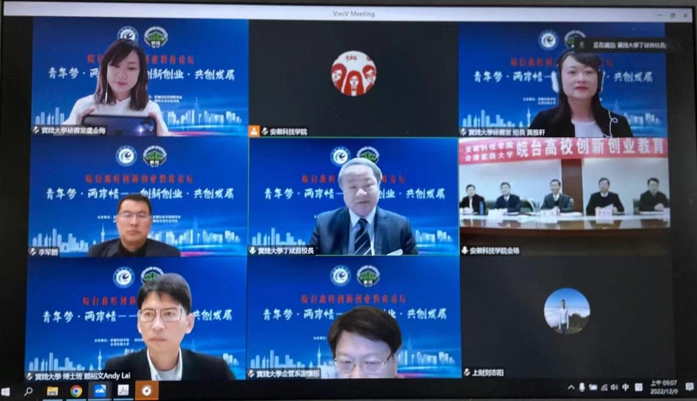 安徽省教育厅外事处四级巡视员刘飞,台湾实践大学秘书室组长黄雅轩,台湾实践大学秘书室卢金梅,我校港澳台事务办公室副主任陈德用、秘书于卉及两校创新创业师生线上全程参加了会议。(特约通讯员:于卉 审核:刘东楼 摄影:陈宝)