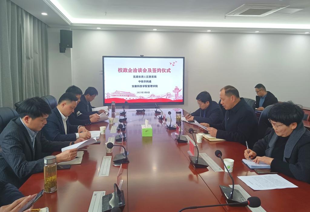 为进一步加强校地(企)合作共建,提升学院人才培养质量,推进毕业生实现高质量就业。3月6日,芜湖市湾沚区教育局、芜湖衣码通信息科技有限公司领导应邀来管理学院洽谈合作事宜。校学术委员会副主任胡月英、管理学院党委书记丁景良、院长陈传万热情接待了来宾一行。