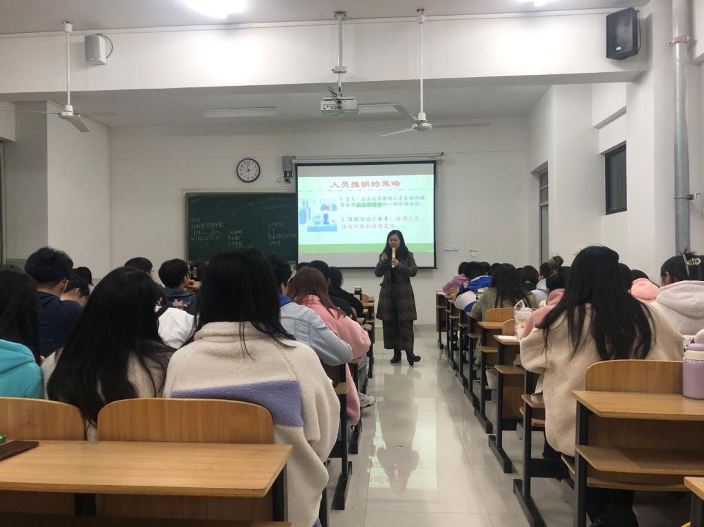 校级“课程思政”示范课程项目负责人王崇彩老师负责《市场营销学》“课程思政”示范公开课主讲,讲授的主要内容为:促销策略。王老师课堂设计围绕“课前初体验+课中加扮演+课后题检验”三个环节,采用理论讲授+角色扮演+视频+案例分析4种教学方式开展。课前,通过新媒体教学工具发布促销选择试题,激发学生的参与热情;课中,基于促销基本理论和推拉理论,组织三位学生进行角色扮演,让学生深切体验促销中“推”和“拉”的差异,启迪学生“从内打破是成长”,号召大家不畏困境,勇于突破自我;课后,通过人员推销形式的案例分享,将当下直播明星“李佳琦”和传统柜台推销人员“张秉贵”的事迹对比,帮助学生树立平等择业观,激励学生求真务实、踏实奋进,积极投身到实现中华民族伟大复兴的热血实践中去。