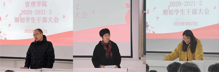 3月17日下午,管理学院在龙湖校区致知楼B111教室召开期初学生干部大会,管理学院党委书记丁景良、党委副书记陶漫、团委副书记汪琦出席会议,学院18、19、20级各班班长、团支书、学习委员、组织委员、宣传委员及学生会全体成员、各学生组织部门负责人参加大会。
