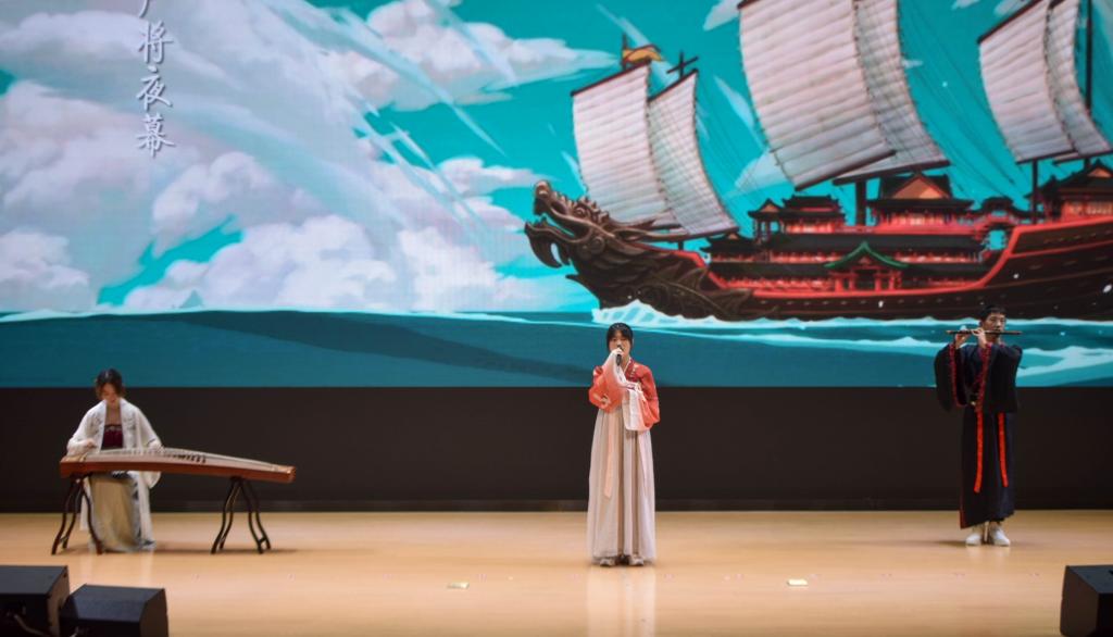 青春的勃发在笛声的律动下陶醉,焚烧的激情在婉转的旋律中彷徨,民乐《大鱼》透过微颤的琴弦,超出幽静的曲调来展现《大鱼海棠》的故事,让人为之动容。轻松愉悦过的游戏环节后。飞扬艺术团带来的舞蹈《savage》更是引爆全场,炫酷的灯光更是营造了激情飞扬的氛围。歌曲《为了谁》歌颂了舍生忘死的抗疫英雄们,讴歌了伟大的抗疫精神。诗朗诵《畅游古诗的海洋》以及歌曲串烧《我的名字》、说唱《飘向北方》、小品《甄嬛传后传》把晚会又一次推向气氛高潮。
