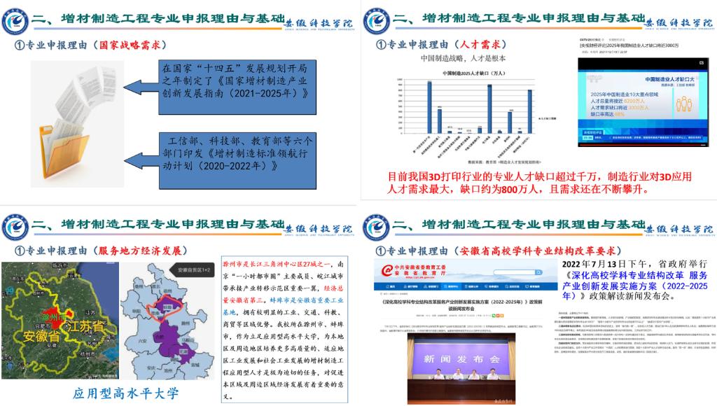增材制造工程专业是依据国家《中国制造2025》、国家“十四五”发展规划《国家增材制造产业创新发展指南(2021-2025年)》、《增材制造标准领航行动计划(2020-2022年)》等重大战略部署,适应深化高校学科专业结构改革服务产业创新发展的专业布局。增材制造工程专业2021年被列入普通高等学校本科专业目录名单,属于新工科专业。随着“中国制造2025”计划实施,产业升级及高端装备业对增材制造工程专业人才需求将显著增加,目前全国仅有8个本科高校开设增材制造工程专业。增设增材制造工程专业将为我国尤其是安徽省和长三角地区增材制造业的发展提供有力的人才支持,也为未来拓宽科研领域、实现科研工作跨越式发展及人才培养具有积极推动作用,为此依托原机电控制工程系相关专业,开展增材制造工程专业的建设。