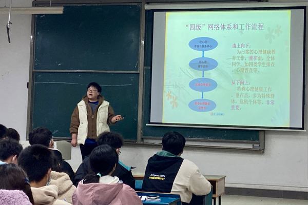 随后,谢宜勤从大学生心理健康状况、我校的心理健康教育工作、学生干部的心理工作职责及角色定位、大学生心理工作实操技能四个方面展开了心理健康教育的论述。其中提到,我国心理健康工作虽然开展较晚,但在进入新时代后的发展十分迅速,随后着重叙述了新时代心理健康工作发展。在讲述心理委员和寝室长的心理工作职责及角色定位时,特别强调了学生干部职责的重要性,每一位学生干部都应当尽职尽责,积极做好同学的心理建设工作。最后,谢宜勤大家详细介绍了我校的心理健康工作:“四类”学生排查、心理健康普测、三大主题活动(“三七”心理健康活动月、“525”心理健康活动月、新生适应周)、心理委员培训、心理知识竞赛等,她希望参与此次培训的同学应该清楚自身的定位,争做心理健康工作的排雷兵、传声员,有困难同学的知心朋友、陪伴者。