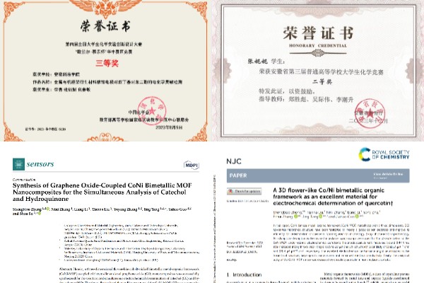 获得奖励:第四届全国大学生化学实验创新设计大赛中荣获三等奖,《大学化学》发表教学类期刊1篇,安徽省第三届普通高等学校大学生化学竞赛二等奖,发表SCI论文3篇,主持省级大创项目1项,参与1项,第十届安徽省大学生课外学术科技作品竞赛中荣获银奖