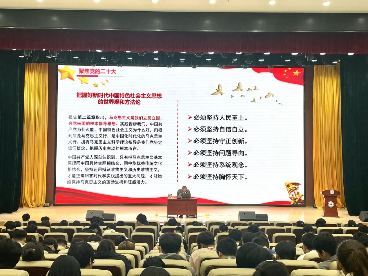 黄树桥详细介绍了党的二十大报告主要内容,系统梳理了党的十八大以来取得的辉煌成就,深入讲解了新时代新征程中国共产党的使命任务,重点解读了党的二十大报告中“实施科教兴国战略,强化现代化建设人才支撑”的内容,教育引导广大青年深入学习领会习近平新时代中国特色社会主义思想的世界观和方法论,立足当前,勤奋学习,勇于实践,将青春献给伟大的中国特色社会主义新时代。讲座中,他还结合近年来学校事业发展所取得的显著成就,介绍了学校“三步走”战略,并展示了学院近年来在人才培养、科学研究、文化传承创新和服务社会等方面取得的成就。他希望同学们在华夏盛世中更应知责奋进,肩负重任时更应顶压前行,在新时代努力做一个既敢于担当、胸怀大局,又脚踏实地、刻苦学习,更心怀感恩、懂奉献的优秀青年。