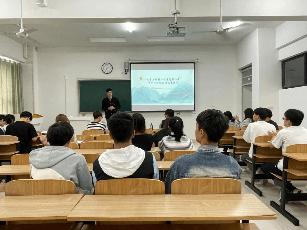 为加大国家语言通用文字推广力度,提升团员青年的对中华优秀传统文化的向往,积极引导学生传承弘扬以语言文字为载体的中华优秀传统文化。10月11日,化学与材料工程学院在致知楼C305教室成功举办“第二届中华经典诵写讲大赛”暨“传承文化经典”主题团日活动。学院学生会指导老师沈竞成、管理学院辅导员黄斐及两位学生代表担任本次比赛评委。