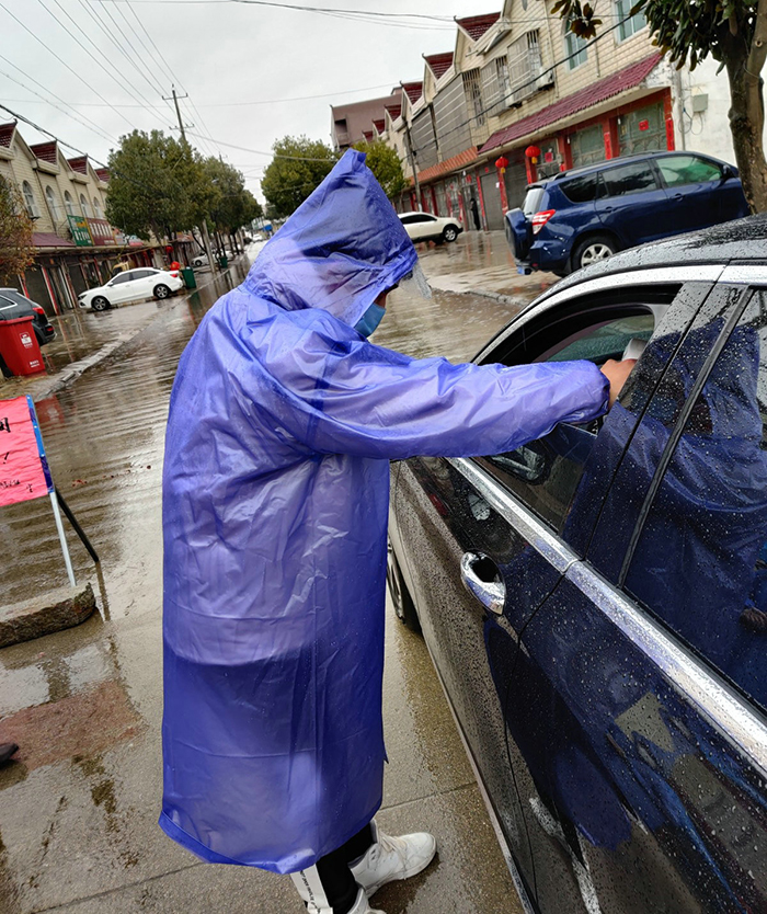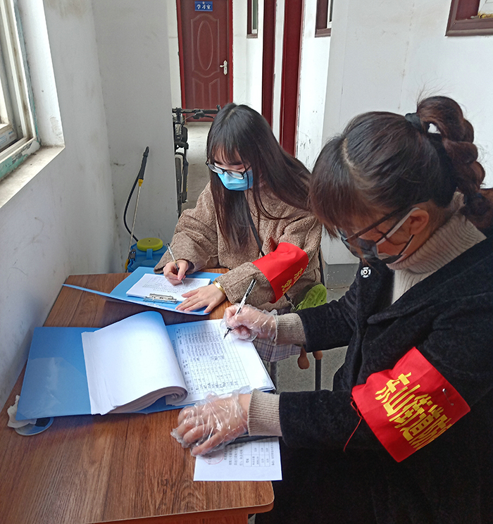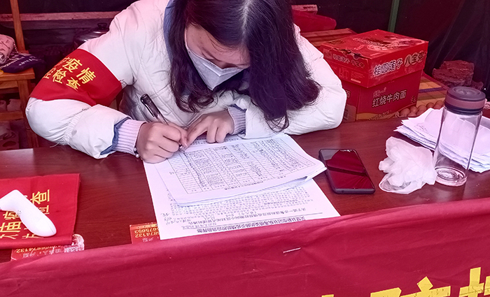赵贝贝,药物制剂192班学生,她积极参加家乡防疫志愿者工作,劝说要出去的村人要戴口罩,就近买东西,尽量不要外出,给要外出务工的人详细指导填写外出告知书,扫码下载智慧阜南。她说:“志愿者的工作内容虽然很简单,对防疫前线来说也许只是绵薄之力,但是对我们来说是人生中浓郁的一笔,面对疫情,我们需要众志成城,只盼武汉加油,祖国加油。”