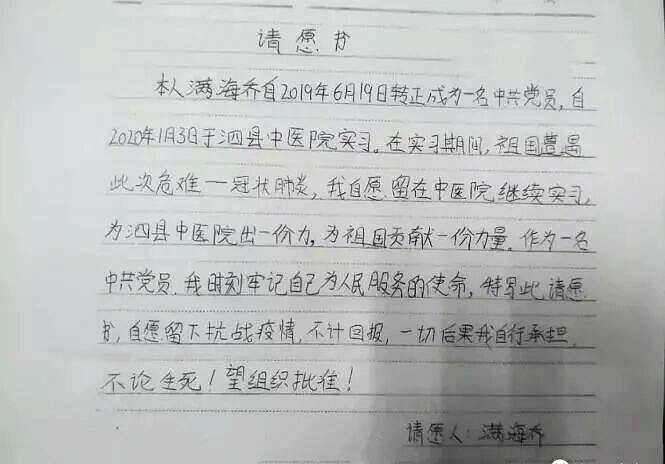满海乔从1月起在泗县中医院(全省唯一县级新冠肺炎定点救治医院)中药房实习。春季刚过,新冠肺炎疫情暴发,院方本着对实习生生命安全负责的原则,及时通知满海乔同学暂停实习工作回家隔离。但身为党员的她,面对疫情没有退缩,第一时间写下请愿书,主动请缨奔赴救死扶伤的一线战场,在请愿书中她说:“祖国遭遇新型冠状病毒危难,我自愿留下抗战疫情,不计回报,自行承担后果,不论生死!”满海乔被安排在该医院的供应室工作,每天与其他同事一起,对各个病区重复使用的手术衣、隔离衣、洗手衣等防护物品进行消毒浸泡、清洗、整理打包及分发送运,打扫、消毒所在科室的生活区和无菌间,抽空还给供应室工作人员领饭送饭。工作期间任劳任怨,为科室分担了不少工作,她用自己的智慧和实干为疫情防控贡献了自己的力量。