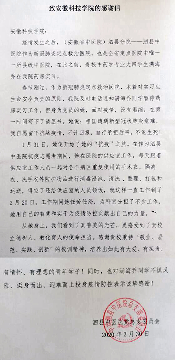 感谢信中,泗县中医院对我校围绕立德树人总任务,培养了像满海乔同学这样有大爱、有担当、有情怀、有理想的青年学子给予了高度评价。对满海乔同学不惧风险、挺身而出、迎难而上投身疫情防控表示诚挚感谢。(特约通讯员:石志成 审核:何永勇 编辑:汤帅)