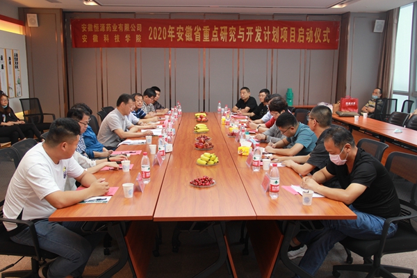 6月22日下午,我校动物科学学院与安徽恒源药业有限公司2020年省重点研究与开发计划项目“中药替代抗生素应用于家禽防病及健康养殖关键技术研究与示范”启动仪式在蚌埠绿地珠峰B座成功举办。动物科学学院院长刘德义教授、蚌埠市科技局副局长杨怀波,九江学院戴四发教授、淮上区农业综合服务站站长吴言柱、安徽恒源药业有限公司总经理王炬,动物科学学院副教授、项目主持人李静出席启动仪式。