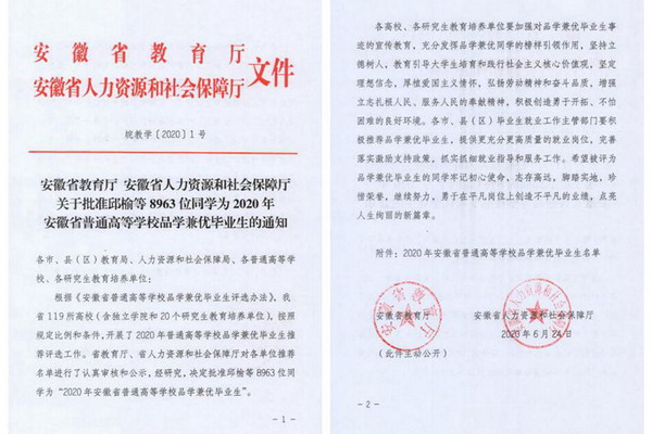 日前,安徽省教育厅、安徽省人力资源和社会保障厅下发了《中国足彩网批准邱榆等8963位同学为2020年安徽省普通高等学校品学兼优毕业生的通知》(皖教学〔2020〕1号),我校曹强等146名同学被授予“2020年安徽省普通高等学校品学兼优毕业生”荣誉称号。