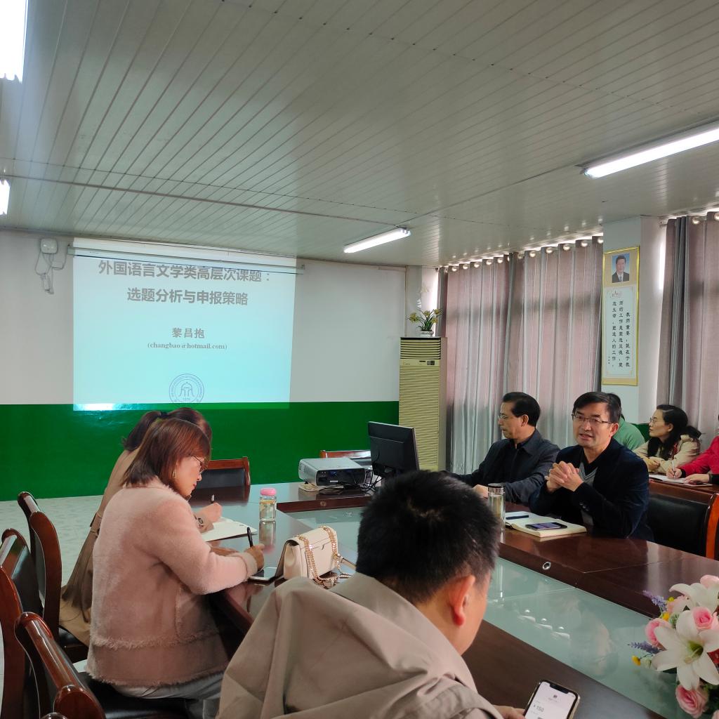 在庆祝学校70华诞之际,在举办应用型高水平大学建设与发展论坛之时,应外国语学院邀请,11月4日下午,浙江财经大学外国语学院院长黎昌抱教授来我校作了题为《外国语言文学类高层次课题:选题分析与申报策略》学术报告,外国语学院全体教师聆听了报告,并与黎昌抱进行了现场交流探讨,报告会由外国语学院院长陈德用主持。