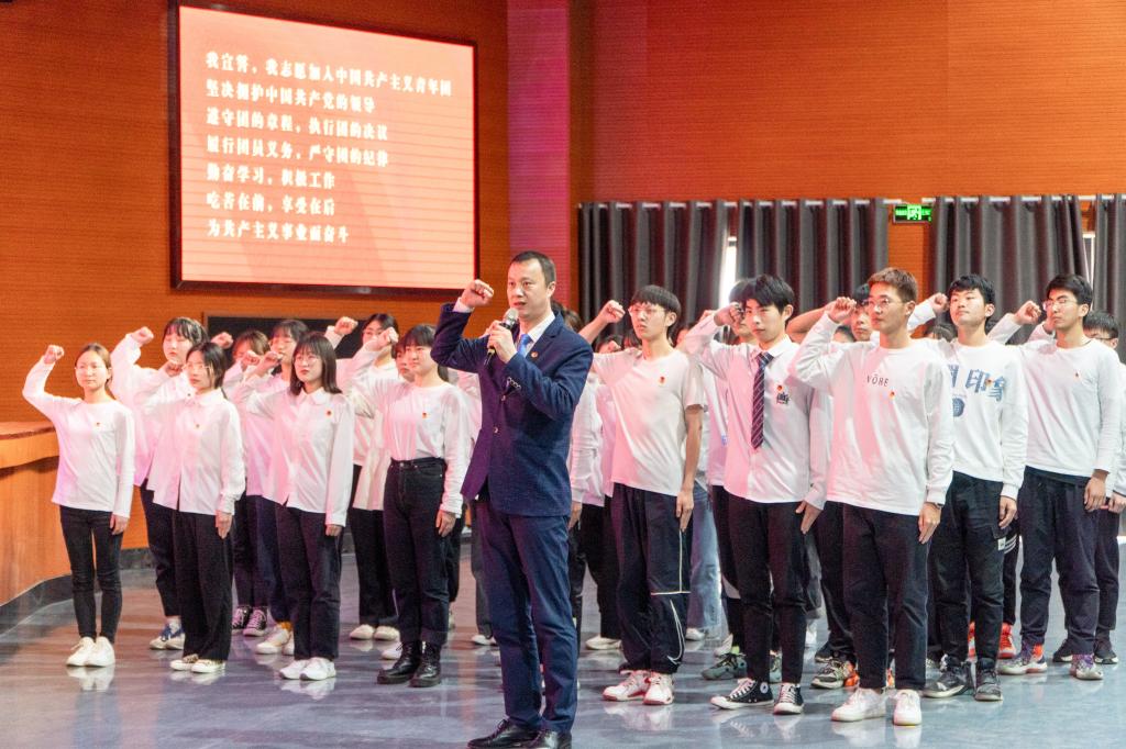 活动现场举行了庄重的入团仪式。校团委书记黄立义为新入团团员代表佩戴团徽,带领新团员宣誓,洪亮、整齐的宣誓声在礼堂中久久回响,让新团员们陡增自豪感,倍感职责使命光荣。新团员代表、生命与健康科学学院中药学专业学生孙诗妍代表全体新团员作发言。