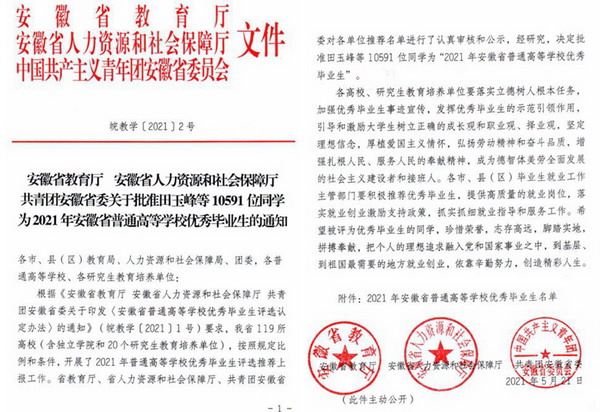 日前,安徽省教育厅、安徽省人力资源和社会保障厅、中国共产主义青年团安徽省委员会下发了《中国足彩网批准田玉峰等10591位同学为2021年安徽省普通高等学校优秀毕业生的通知》,我校孟瑞瑞等148名同学被授予“2021年安徽省普通高等学校优秀毕业生”荣誉称号。