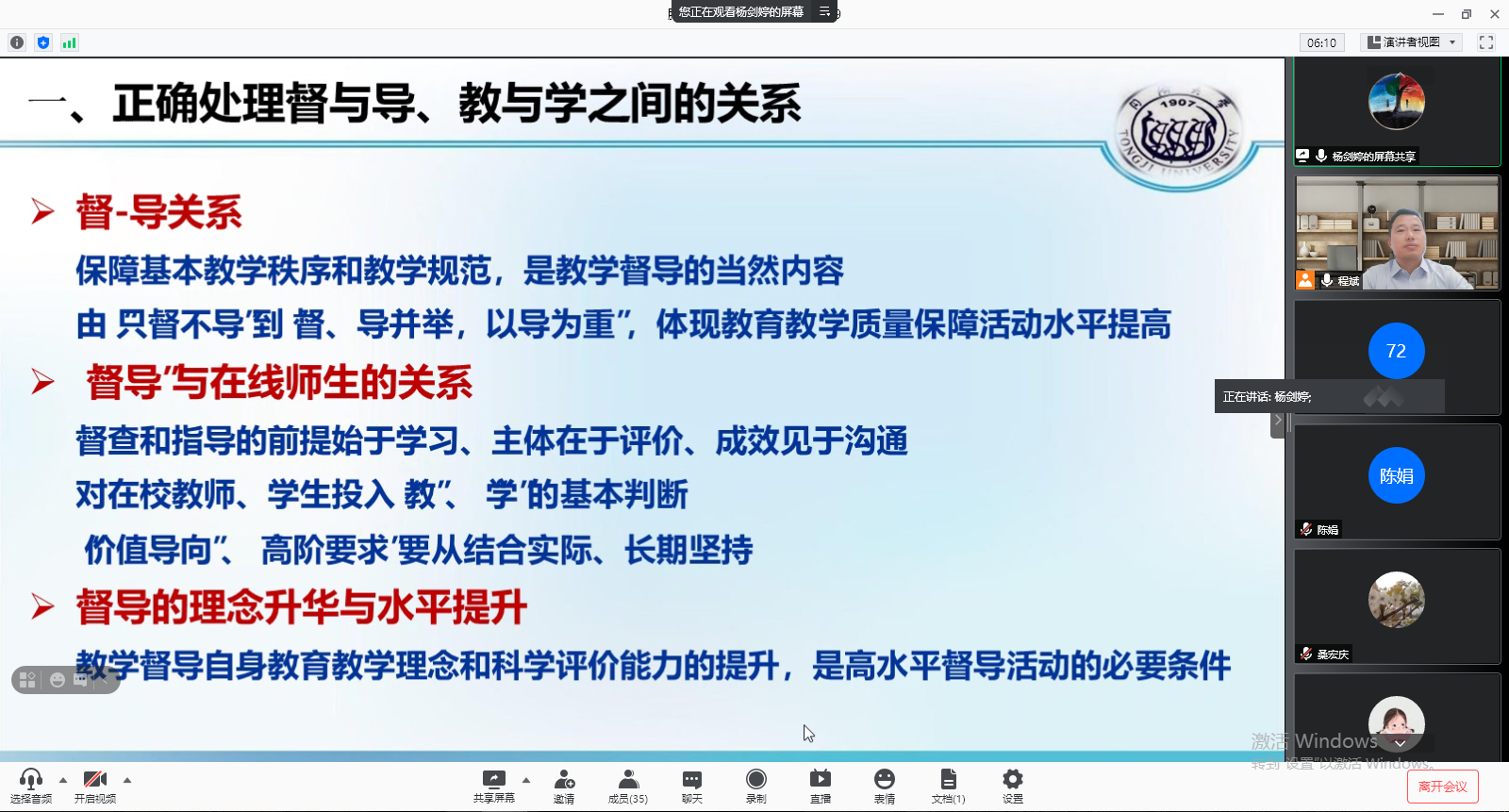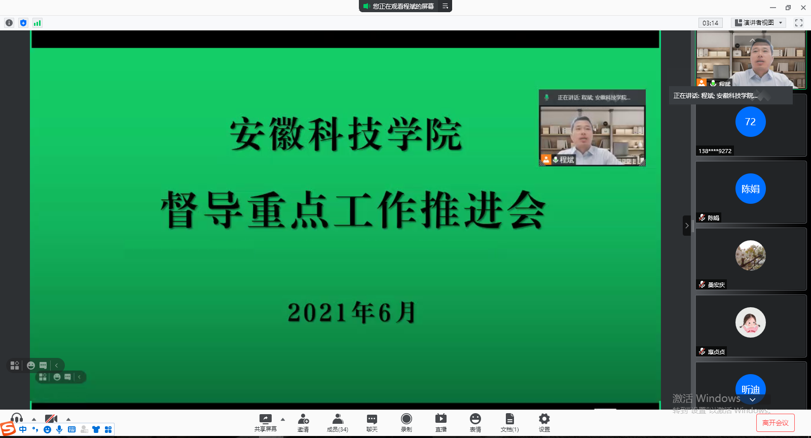 为深化党史学习教育,推进下一阶段督导重点工作顺利开展,6月18日上午,督导考核办公室利用腾讯会议平台,召开教学督导线上工作会议,全体校教学督导员、院级督导组组长及督导考核办公室工作人员参加了会议,会议由督导考核办公室主任程斌主持。