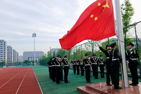 6时40分,国旗护卫队队员们着装整齐,迈着矫健的步伐,护卫着鲜艳的五星红旗入场举行升旗仪式。伴着庄严的《义勇军进行曲》的响起,五星红旗冉冉升起,同学们向国旗行注目礼,深怀着对祖国无限的热爱和崇高的敬意。
