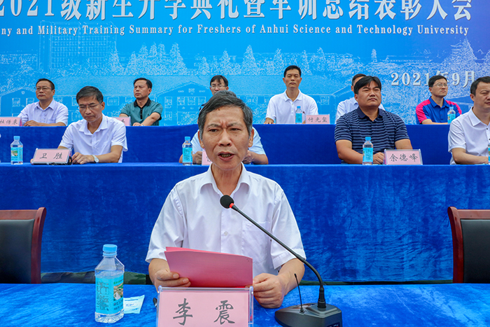 李震在开学典礼上致辞。他首先代表学校领导和全体师生员工向2021级新同学的到来表示热烈欢迎,向辛勤培养新生的父母和老师表示崇高敬意,向长期关心、支持我校建设与发展并承担军训任务的解放军陆军装甲兵学院蚌埠校区的领导和教官表示衷心感谢,并介绍学校的办学历程及近年来取得的办学成就。他指出,安徽科技学院建于1950年,1965年开始举办本科教育,办学71年来,已累计输送10万多名优秀毕业生。现已发展成为一所办学历史悠久、文化底蕴深厚、多学科协调发展的省属本科院校。近年来,学校各项事业取得长足发展,实现新的突破,龙湖校区投入使用,“一校两区、协调发展”的办学格局已经形成。他强调,迈进新时代,学校将以习近平新时代中国特色社会主义思想作为指导,全面贯彻党的教育方针,落实立德树人的根本任务,按照第三次党代会确定的“三步走”发展战略,朝着“十四五”时期更名为大学,2035年建设成“现代化全国一流应用型大学”的目标砥砺前行。
