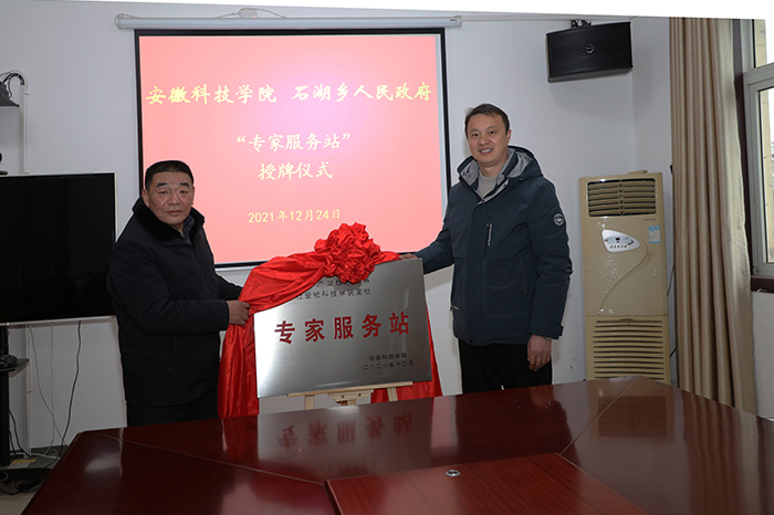 黄立义与徐淼代表校企双方为安徽科技学院“专家服务站”揭牌。