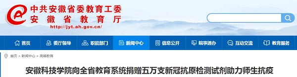 我校党委和行政高度重视新冠肺炎疫情防控,充分发挥学校应用型研究的传统优势,及时组建并全力支持生命与健康科学学院刘国东教授新冠肺炎检测研发科研团队加强技术研发攻关。日前,校园网一则有关“100箱5万剂由我校生命与健康科学学院科研团队联合英飞凌生物科技(江苏)有限公司研发生产的SARS-CoV-2抗原快速检测试剂,通过物流快递从我校凤阳校区发往驻肥多所大中专学校,助力全省疫情防控”的报道,受到了人民网、中青网、中国网、中国教育在线、安徽教育网、今日头条、凤凰网、新浪网、安青网等众多媒体关注。本网作整理汇编并滚动推出,以飨读者。