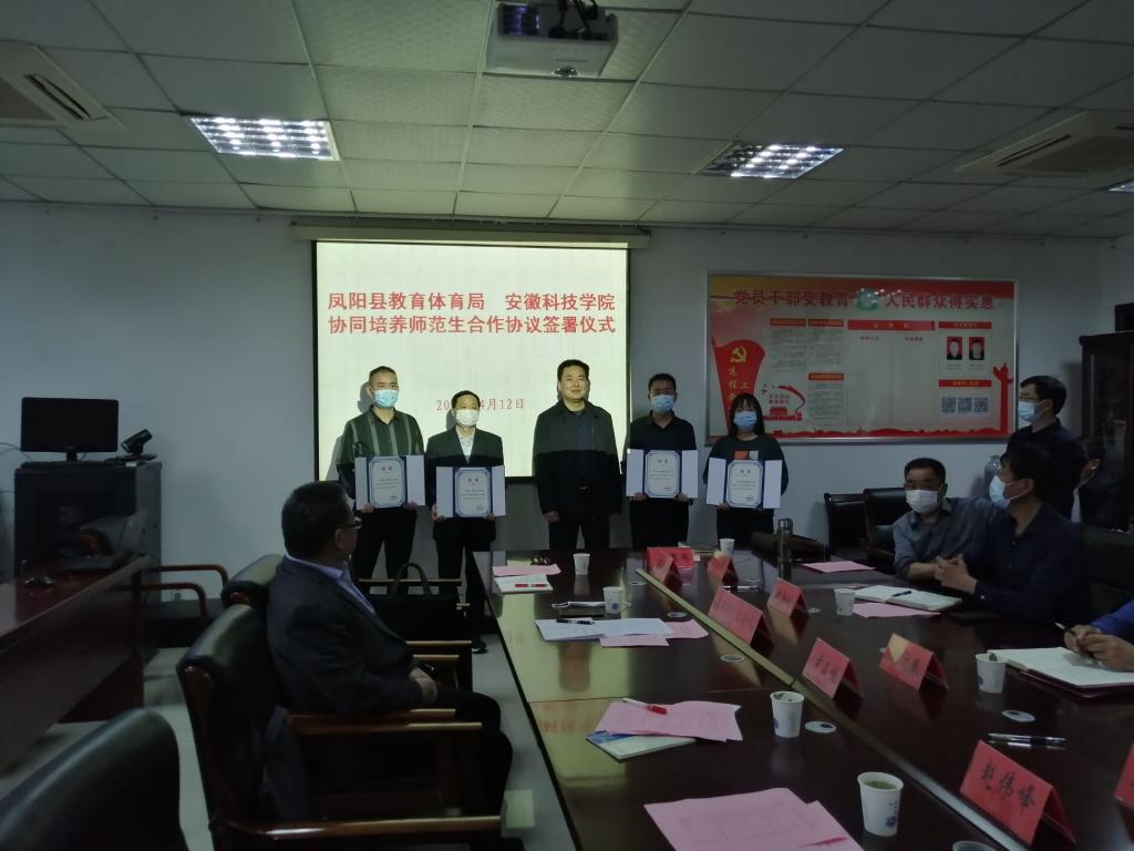 为积极探索师范生教育实践工作,建立高校、地方教育行政部门和基础教育学校权责明晰、稳定协调、合作共赢的“三位一体”师范生协同培养机制,构建教师培养、培训、研究和服务一体化的合作共同体,推动我校师范类专业认证工作,4月12日下午,安徽科技学院与凤阳县教育体育局协同培养师范生合作协议签署仪式在凤阳县教育体育局三楼会议室隆重举行。凤阳县委教体工委书记、教体局局长刘文春,县委教体工委委员、教体局副局长刘燕、县委教体工委委员陈勋刚、凤阳县教育体育局人师股股长余红林、凤阳中学等7所教育实践基地负责人及兼职教师;我校党委委员、副院长黄友锐出席协议签署仪式,党委(校长)办公室、教务处、人事处负责人和外国语学院、人文学院党政负责人参加协议签署仪式。签约仪式由我校党委(院长)办公室主任曾献功主持。