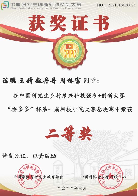 2022年7月18日,我校陈鹏、王婧、赵丹丹、周椿富四位研究生,收到了中国研究生乡村振兴科技强农+创新大赛“拼多多杯”第一届科技小院大赛组委会颁发的二等奖荣誉证书。