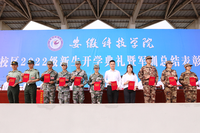 军训操演结束后,李震代表学校向陆军装甲兵学院蚌埠校区教官赠送锦旗;黄远友作军训总结讲话;李升和宣读表彰决定。与会领导为军训先进集体和先进个人代表颁发了荣誉证书并合影留念。(摄影:陈宝 审核:姚文均 编辑:董秋瑞)