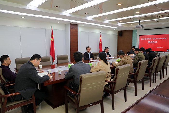 李升和首先宣读了安徽科技学院第一届实验室安全督导员聘任名单。周金星介绍了督导组的成立背景及首届督导员的推选过程。经个人自荐、学院推荐和学校遴选,聘请柳卫国、徐冬青、简兴、郑胜彪、纪文超、杨续昌、于鲲等7位教师为我校首届实验室安全管理督导员,聘期一年。
