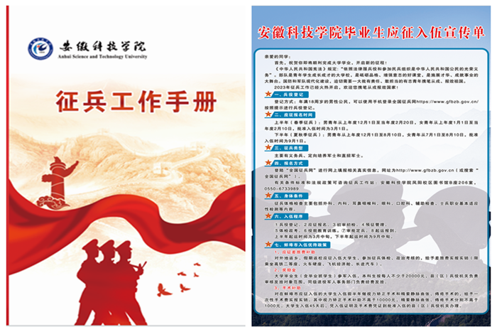 立体化宣传强化新希望。编印发放500多册安徽科技学院征兵工作手册,涵盖法规、政策和征兵工作指南,成为领导干部和一线工作人员征兵的有力帮手。制作发放3500余份“致安科2023届毕业生的一封信”宣传彩页,做到应届毕业生人人知晓应征程序、优待政策和咨询电话。各学院利用主题班会、征兵工作动员大会、辅导员专题会议、谈心谈话等形式,利用班级qq工作群、易班专栏、微信公众号、网站等多媒体矩阵发布征兵动态、传播政策信息,营造立体化、全方位、多层次的宣传新格局,助推征兵工作掀起新高潮。