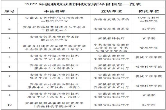 随着2022年度各类高层次科技创新平台立项结果陆续公布,我校科技创新平台立项数量喜获丰收,全年共获批省部级科技创新平台10个,立项数创历史新高。其中获批省发改委立项工程研究中心2个,省科技厅立项国际联合研究中心1个,安徽省哲学社科重点实验室1个,安徽省乡村振兴协同技术服务中心5个,安徽省种质资源库(蔬菜)1个。至此,我校省部级科技创新平台达到32个,学科分布领域涉及农、工、人文社科等学科,服务支撑学科建设的科技创新“大平台”架构初步建成,科技创新体系进一步完善,为学校更名大学行动计划的顺利实施奠定了坚实基础。另外,根据安徽省科技厅中国足彩网2019、2020年认定的共25家省重点实验室验收结果,我校牵头建设的动物营养调控与健康安徽省重点实验室建设期满顺利通过验收并获评良好等次,是对我校科技创新平台建设成效和管理工作的充分肯定。