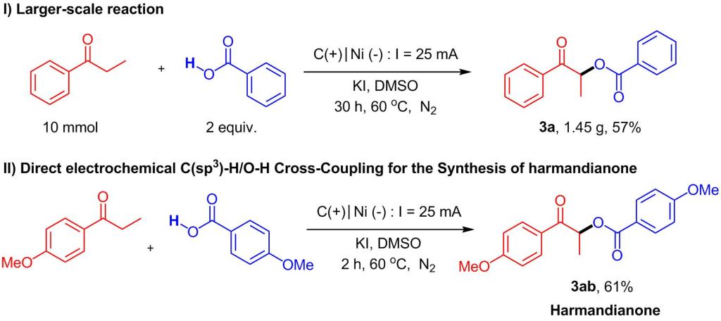 α-酰氧基酮是一个重要的结构单元,广泛存在于天然产物、生物活性化合物中,并作为药物化学的潜在中间体。有机电化学合成利用电子作为清洁的反应物来实现化学氧化剂的功能,已发展成为构建化学键的有力合成工具。由于羧酸的低亲核性,电化学氧化C(sp3)-H/RCOOH交叉偶联具有很大的挑战性。基于此,本论文报道了一种简便绿色的α-酰氧基酮类化合物的构建策略,利用电化学氧化,在无外加氧化剂、催化剂的条件下,实现了C(sp3)-H/RCOOH交叉偶联反应。该反应表现出优异的底物普适性,各种羧酸和酮类化合物都适用于该反应。此外本文对反应的实用性进行了研究。尝试了克级反应,目标产物同样取得了中等的收率。直接实现了具有药物活性分子Harmandianone的一步合成产率达到61%。此外,该工作也研究了反应的历程,对相关反应的研究具有重要的指导意义。(特约通讯员:沈竞成 图片来源:吴际伟 审核:张炎 编辑:张威)