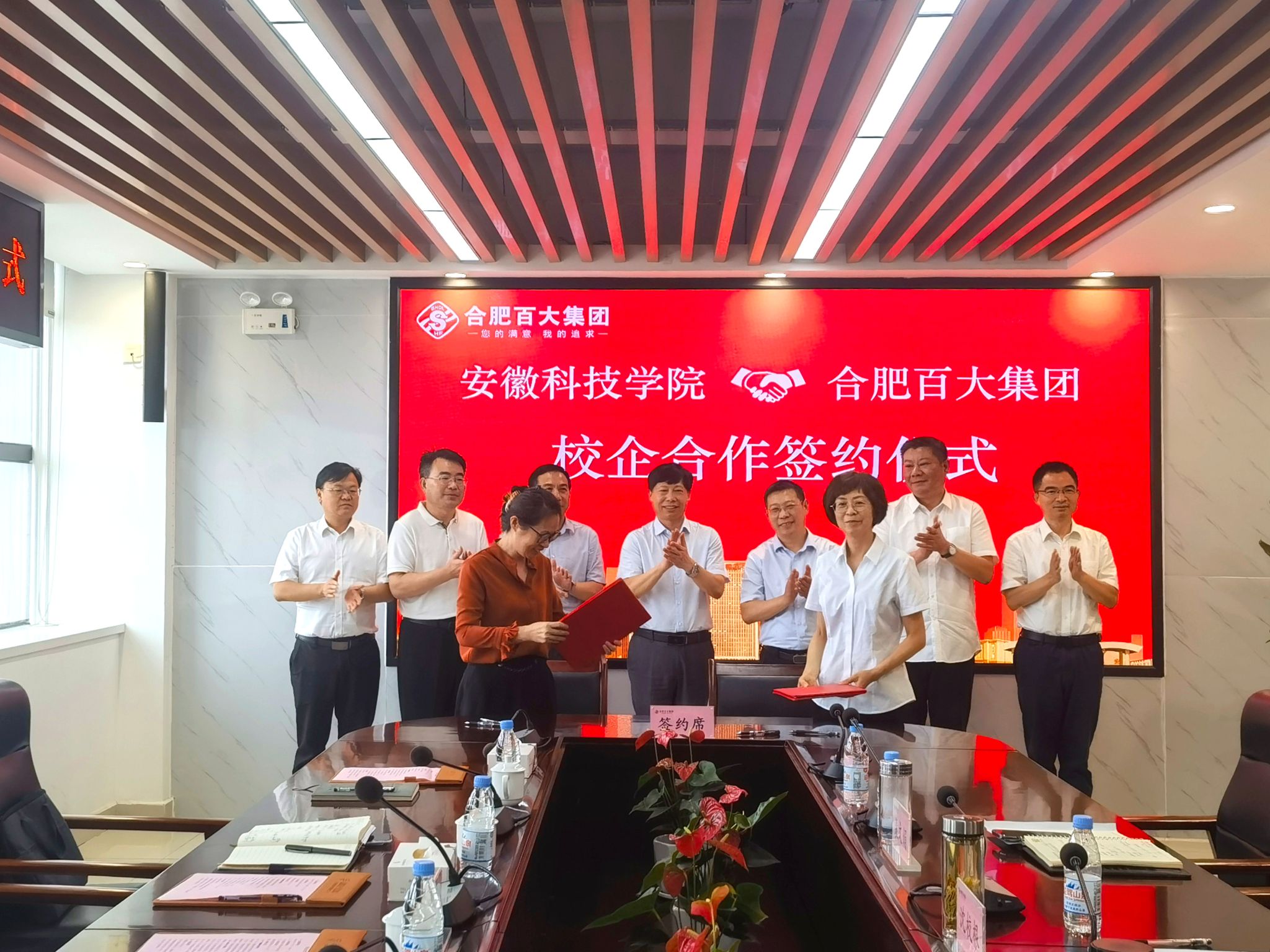 财经学院院长郝世绵和百大集团党委委员、工会主席裴文娟代表双方签署了《合肥百大集团 安徽科技学院战略合作协议》;双方观看了合肥百大集团宣传片,并围绕智力共用、人才共育、项目共研、平台共享等进行深入交流。