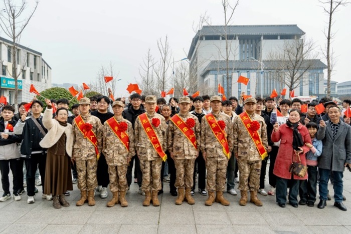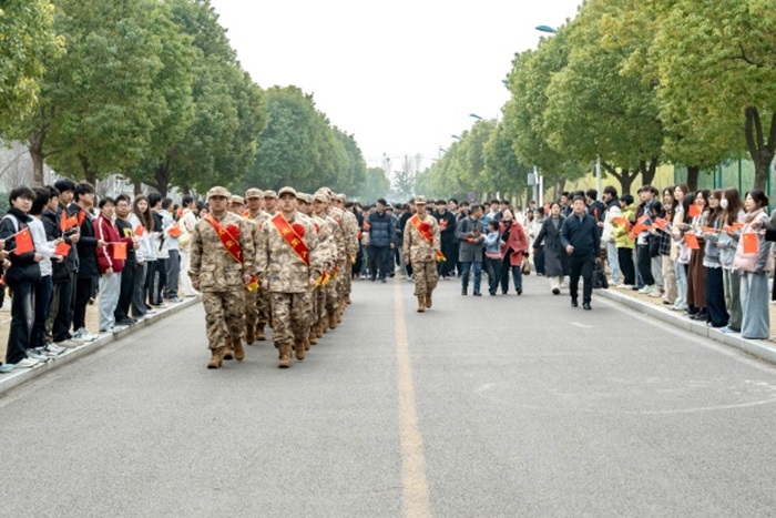 欢送会结束,与会领导与广大师生夹道欢送应征入伍学生,现场气氛热烈。新兵们身披绶带,胸戴大红花,精神抖擞,带着青春的梦想与热血,踏上保家卫国的新征程。