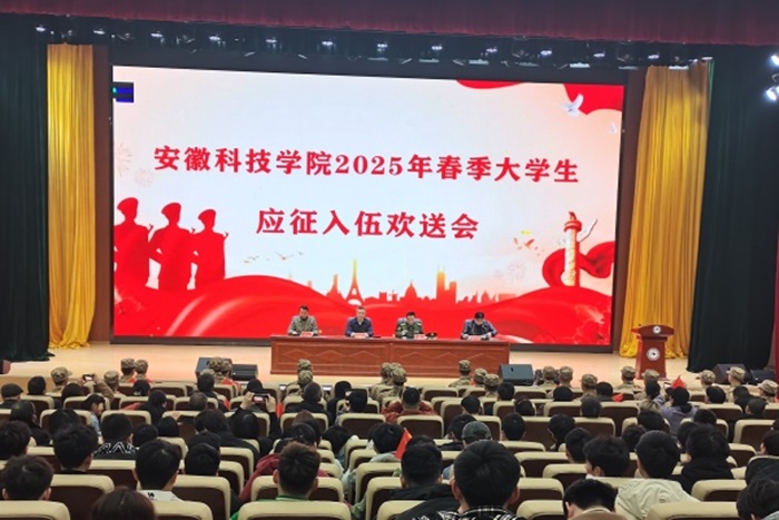 3月12日上午,学校2025年春季大学生应征入伍欢送会在龙湖校区东辅楼二楼报告厅举行。校党委副书记曹付忠、蚌山区人民武装部部长曾鸣出席欢送会。学生处、人武部负责人、各学院党委副书记、应征入伍学生辅导员、学生家长代表、在校生代表参加欢送会。欢送会由党委学工部部长、学生处处长黄立义主持。