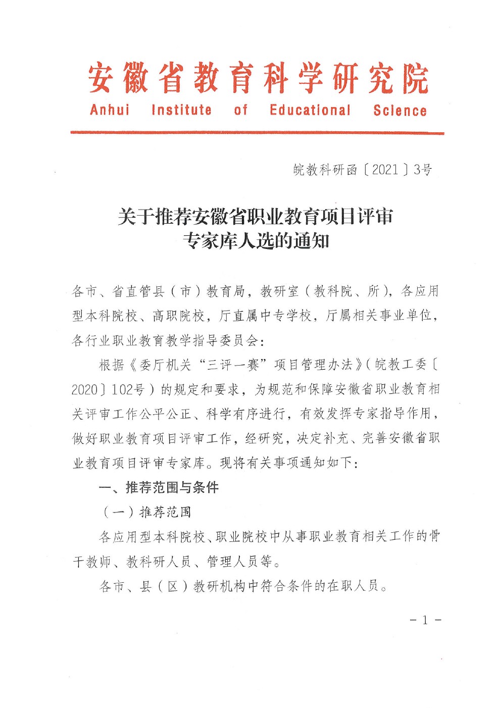 中国足彩网推荐安徽省职业教育项目评审专家库人选的通知